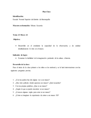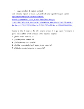 El plan de clase tiene como objetivo desarrollar la capacidad de observación y análisis de los estudiantes mediante una visita virtual al Museo Británico en 3D. Los estudiantes ingresarán individualmente al museo virtual a través de un enlace y tomarán notas sobre lo que observan. Luego, se reunirán en grupos para compartir sus experiencias y discutir qué les pareció la visita virtual al museo en 3D.