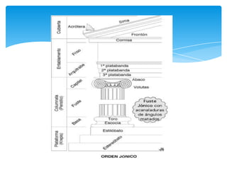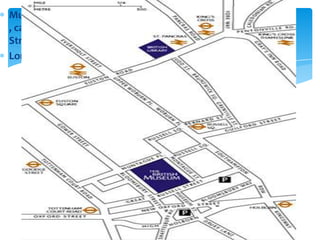 El documento resume la historia y características arquitectónicas del Museo Británico en Londres. Fue diseñado por Robert Smirke en estilo neoclásico griego y se construyó entre 1852 y 1857 para albergar la colección donada por Sir Hans Sloane. El museo tiene planta cuadrada con cuatro alas y un gran patio interior con la sala de lectura. Su diseño emula edificios griegos clásicos como el Partenón con columnas y frontones.