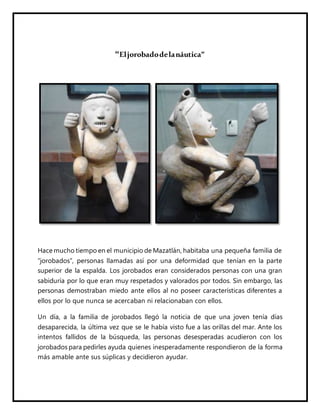 Este documento narra la historia de una familia de "jorobados" en Mazatlán que eran muy respetados por su sabiduría. Cuando una joven desapareció cerca del mar, la gente desesperada pidió ayuda a los jorobados. Miguel, uno de los hijos, tomó una antorcha para buscarla. Aunque encontró a la muchacha sana y salva, días después hallaron a Miguel muerto por una picadura, sosteniendo aún la antorcha. En su honor, el pueblo erigió una escultura en la pos