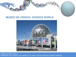 El documento describe el Edificio Science World en Vancouver, Canadá. Originalmente construido para la Expo '86, el edificio cuenta con una estructura geodésica diseñada por R. Buckminster Fuller. Actualmente funciona como un museo de ciencia popular con exhibiciones interactivas permanentes y temporales sobre temas como el cuerpo humano, agua, luz y medio ambiente. La estructura geodésica provee un espacio amplio y eficiente que alberga las diversas áreas del museo.