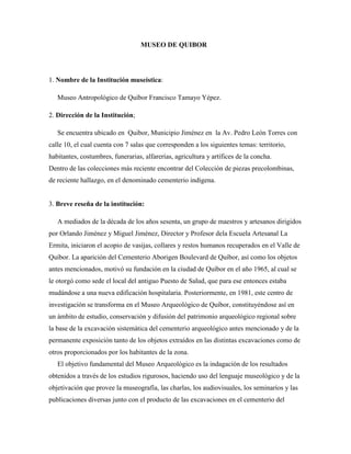 El Museo Antropológico de Quibor Francisco Tamayo se encuentra en Quibor, Lara. Fue fundado en 1965 para albergar artefactos precolombinos recuperados en la región, incluyendo vasijas, collares y restos humanos. Actualmente cuenta con siete salas temáticas y una valiosa colección de piezas líticas, cerámicas, de concha y restos óseos que datan desde el Pleistoceno hasta la época colonial, provenientes de excavaciones en el valle de Quibor. El museo se ha