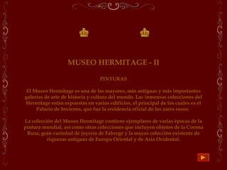 El Museo Hermitage alberga una de las mayores y más antiguas colecciones de arte e historia del mundo, originalmente compuesta por la emperatriz Catalina la Grande. A lo largo de los siglos, la colección imperial se expandió para incluir obras maestras de artistas como Leonardo da Vinci, Rafael, Rembrandt y Monet, así como tesoros de diferentes culturas. El museo actualmente se exhibe en varios edificios del antiguo Palacio de Invierno de los zares rusos.