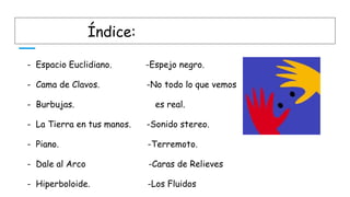 El documento presenta la información de un museo interactivo llamado Mirador, incluyendo una lista de integrantes y una descripción de las exhibiciones. Algunas de las exhibiciones descritas son: una cama de clavos, una fuente de burbujas, una simulación de la Tierra, un piano que se puede tocar con los pies, un espacio con espejos que multiplican las imágenes, y una sala que simula terremotos.