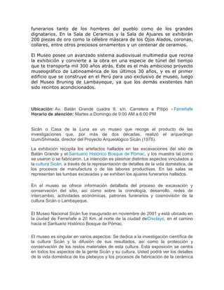 El Museo Nacional Sicán está dedicado a la cultura Sicán que se desarrolló en el norte de Perú entre los años 700-1300. El museo exhibe artefactos como máscaras funerarias de oro, cuchillos ceremoniales y réplicas de tumbas que muestran las costumbres funerarias de los sicanes. También cuenta con salas que describen aspectos de la vida cotidiana y procesos de manufactura de la cultura Sicán, basándose en las excavaciones arqueológicas realizadas en el sitio de Batán Grande.