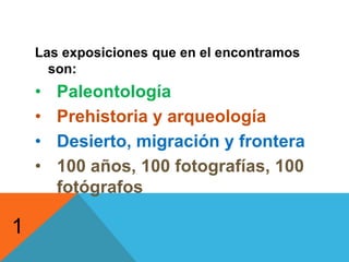 El museo cuenta con varias exposiciones permanentes que incluyen paleontología, prehistoria y arqueología, el desierto, la migración y la frontera, y 100 años, 100 fotografías, 100 fotógrafos. La sección de paleontología muestra fósiles de diferentes eras geológicas incluyendo mamuts, dinosaurios y monstruos marinos. La sección de prehistoria y arqueología presenta la vida de los pueblos Yumanos a través de los tiempos en el Holoceno temprano, medio y