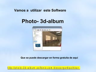 Este documento proporciona instrucciones para descargar e instalar el software gratuito Photo-3D-album, crear una galería de fotos 3D, exportarla como un archivo ejecutable .exe para compartir con otros, y cargar el archivo ejecutable a un disco duro virtual en línea para facilitar el envío.