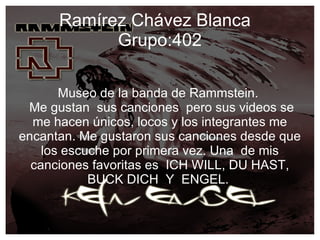 El documento habla sobre la banda alemana de metal industrial Rammstein. Menciona que al autor le gustan sus canciones e videos únicos, y nombrar algunas canciones favoritas. También proporciona detalles sobre el origen del nombre de la banda, los miembros, y las fechas de lanzamiento de sus 8 álbumes de estudio.