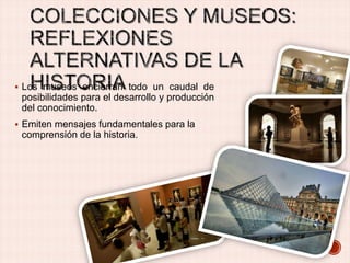 El documento describe varios museos en el estado de Sonora, México. Habla sobre el primer museo de Hermosillo ubicado en una antigua cárcel del siglo XIX y su objetivo de preservar la identidad cultural local. También menciona el Museo de las Culturas de Sonora que alberga valiosas piezas arqueológicas e históricas de la región noroeste, incluyendo momias de Yécora. Finalmente, brinda detalles sobre el Museo Étnico de los Seris, el Museo Casa Hoeffer