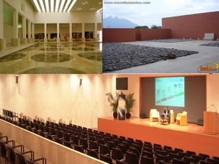 Este documento describe brevemente varios museos importantes en Nuevo León, México. Incluye información sobre la arquitectura y diseño distintivos del MARCO Museo de Arte Contemporáneo, el Museo de Historia Mexicana, el MUNE Museo del Noreste, el Planetario Alfa, el Museo del Vidrio, el Museo del Acero Horno3 y el Museo del Obispado. Cada museo tiene características arquitectónicas únicas que reflejan su propósito y colecciones.