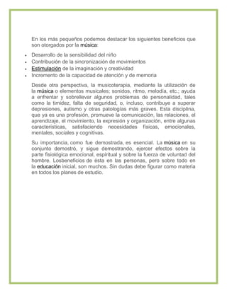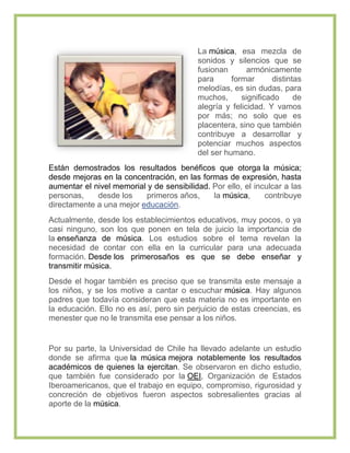 La música tiene muchos beneficios para el desarrollo humano como mejorar la concentración, expresión y memoria. También contribuye a una mejor educación cuando se enseña desde edades tempranas. Estudios demuestran que la música mejora los resultados académicos y fomenta el trabajo en equipo y compromiso. Debe ser incluida en los planes de estudio desde los primeros años por sus beneficios en el desarrollo de la sensibilidad, imaginación, atención y memoria de los niños.