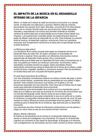 La música tiene un gran impacto en el desarrollo integral de los niños. Estimula áreas como el desarrollo físico, socioemocional y cognitivo. La música fortalece los lazos entre los padres y los bebés, y ayuda en el desarrollo del lenguaje y la memoria de los niños. Programas de música como el de Gymboree ofrecen a los niños la oportunidad de crecer de manera holística a través de actividades musicales seguras y divertidas.