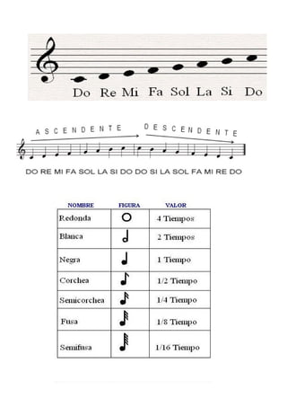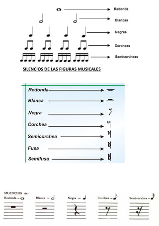 El documento presenta pentagramas en blanco para que los estudiantes practiquen dictados musicales, identificando silencios de diferentes figuras musicales como negras, corcheas y semicorcheas.