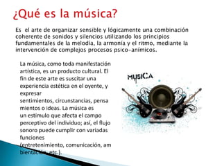 La música es el arte de organizar sonidos y silencios utilizando principios como la melodía, armonía y ritmo. Tiene como objetivo suscitar una experiencia estética en el oyente y expresar sentimientos. Está compuesta por sonidos, que son vibraciones percibidas por el oído, y silencios. Los parámetros fundamentales del sonido son la altura, duración, intensidad y timbre. La organización coherente de los sonidos y silencios da lugar a la melodía, armonía y ritmo.