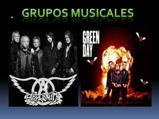 El documento proporciona información sobre varias bandas de rock como Aerosmith, Green Day, My Chemical Romance, Mago de Oz y Maná. Resume su historia, estilo musical y discografía principal en 1 o 2 oraciones por banda.