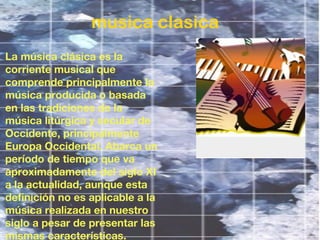 El documento resume diferentes géneros musicales como la música clásica, el country, el rock, el pop y el EDM. La música clásica se refiere a la música producida en Europa Occidental entre los siglos XI y la actualidad. El country surgió en los años 1920 en Estados Unidos y Canadá como una combinación de música folclórica europea e influencias de blues y gospel. El rock se originó de la fusión de rhythm and blues y country, incorporando también elementos de blues y folk. El pop surgió a finales de los 1950 como una derivación del rock and roll