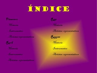 El documento proporciona información sobre diferentes géneros musicales como el flamenco, rock, rap y reggae. Resume la historia, instrumentos y artistas representativos de cada género. El flamenco se originó en Andalucía y se caracteriza por el cante, las palmas y la guitarra. El rock surgió en los años 60 con instrumentos como la guitarra, bajo y batería. El rap emergió en Nueva York en los 70s centrándose en la vida en los guetos. El reggae proviene de Jamaica con énfasis en
