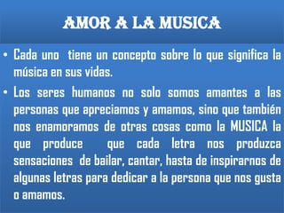 La música es importante en la vida de las personas y puede inspirar sentimientos de amor, alegría y tristeza. Los artistas se inspiran en las musas y componen canciones como una forma de arte y expresión. Existen diferentes géneros musicales y muchos artistas talentosos que escriben sus propias letras para transmitir emociones a través de la música.