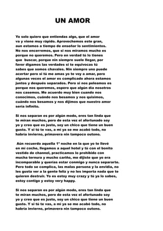 Este poema expresa los sentimientos de amor de un hombre por una mujer. Describe cómo su amor es a veces complicado pero infinito, y cómo recuerda con cariño los momentos especiales que han compartido juntos. Teme que fuerzas externas como la envidia de otros puedan separarlos, pero promete que siempre la amará.