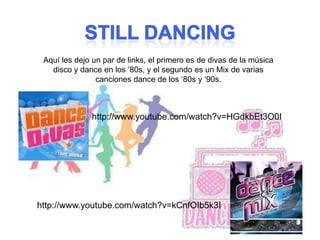 El documento proporciona dos enlaces de video, el primero presenta divas de la música disco y dance de los años 80, y el segundo es una mezcla de varias canciones dance populares de los años 80 y 90.