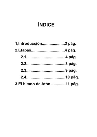 Este documento resume la historia de la música en el Antiguo Egipto y Mesopotamia. Se divide en cuatro etapas principales: el Imperio Antiguo, el Imperio Medio, el Imperio Nuevo y el Periodo Tardío. Describe los instrumentos musicales típicos de cada época, como flautas, arpas y tambores. También destaca el Himno a Atón, una obra maestra de la literatura religiosa egipcia atribuida a Akenatón.