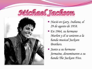 El documento proporciona información biográfica sobre varios artistas musicales populares como Michael Jackson, Madonna y One Direction. Resume los orígenes, logros y álbumes más destacados de cada uno.