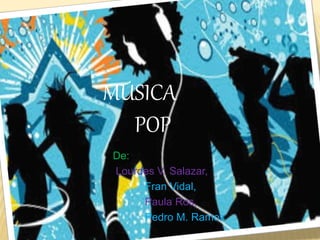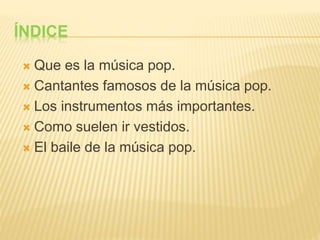 Este documento resume los aspectos clave de la música pop. Explica que la música pop se originó a finales de los 1950 como una fusión del rock and roll con otros géneros populares de la época. Enumera algunos de los cantantes más famosos de pop como Shakira, Beyoncé y Justin Bieber. También describe los instrumentos más comunes como la batería, guitarra eléctrica y teclado, y cómo los artistas pop suelen vestir dependiendo de si están en una gala o grabando un video musical. Finalmente, discute que el baile de