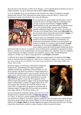 El documento proporciona una historia detallada del origen y desarrollo del reggae en Jamaica. Comenzó en la década de 1960 cuando artistas como Toots & The Maytals empezaron a desarrollar un sonido único influenciado por el rock, el ska y los ritmos africanos. En la década de 1970, figuras como Bob Marley y Jimmy Cliff popularizaron el género más allá de Jamaica a través de sellos como Island Records. El reggae se convirtió en un vehículo para transmitir los mensajes del movimiento rastafari y