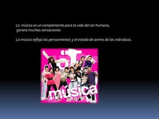 La música genera muchas sensaciones y es un complemento para la vida humana, reflejando los pensamientos y estado de ánimo de los individuos.