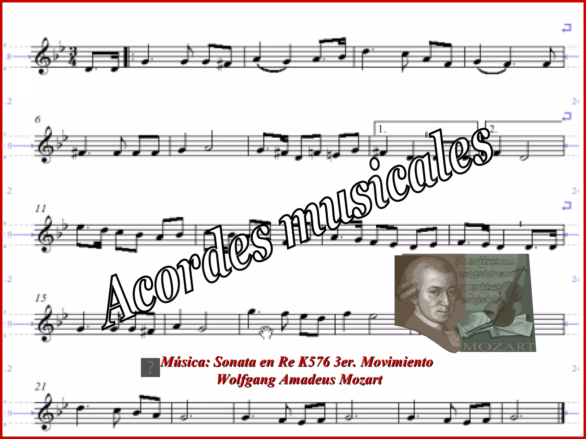 El documento describe los beneficios terapéuticos de la música y el llamado "Efecto Mozart". Estudios encontraron que escuchar la música de Mozart mejoró el razonamiento espacial temporal en estudiantes. La musicoterapia se usa para tratar estrés, ansiedad y otros problemas físicos y mentales mejorando la calidad de vida. El documento recomienda piezas musicales para tratar diferentes condiciones como insomnio, dolor de cabeza y más.