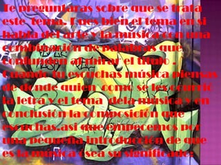 El documento habla sobre el arte y la música. Explica que la música es un arte que surge del alma y el corazón, a veces de forma espontánea sin bases musicales formales. También menciona que la música tiene varios significados y es una expresión cultural que puede adoptar diferentes formas como la lírica o las "tiraderas". Finalmente, señala que las personas que les gusta escuchar música también les gusta componer y que cada persona tiene su propio gusto musical.