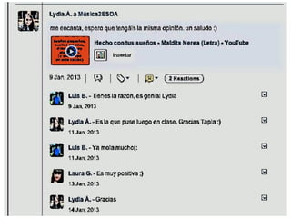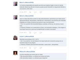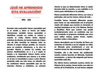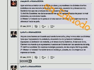 Este documento describe varios proyectos de aprendizaje musical en entornos formales e informales con y sin tecnología. Los estudiantes comparten aulas virtuales, componen rap y música, graban presentaciones y videos, y colaboran con estudiantes de otros países. Aprenden música, creatividad, trabajo en equipo y otras habilidades. Documentan su aprendizaje en portafolios y se evalúan mutuamente para mejorar continuamente.