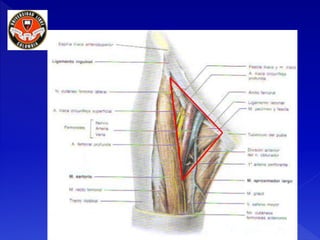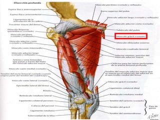 Este documento describe la anatomía de los nervios y músculos del muslo. Explica que el muslo está dividido en tres compartimentos - anterior, medial y posterior - separados por tabiques intermusculares. Describe los orígenes, trayectos y distribuciones del nervio femoral, nervio obturador y nervio ciático, así como los orígenes, inserciones, acciones e inervaciones de varios músculos del muslo como el cuadriceps femoral, psoas mayor, sartorio y los músculos aductores.