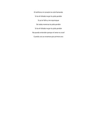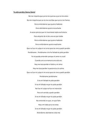 El cantante le pide perdón a su pareja por algún error que cometió en la relación. Explica que no fue su intención fallarle y que quiere hablar con ella para aclarar lo sucedido. Repite varias veces la frase "te pido perdón" para enfatizar su arrepentimiento.