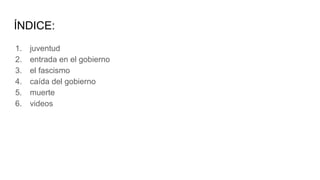 Este documento resume la vida y carrera política de Benito Mussolini, líder fascista de Italia. Detalla su juventud rebelde, su ascenso al poder aprovechando el descontento posterior a la Primera Guerra Mundial, y el establecimiento del régimen fascista en Italia. Más adelante, explica la caída del fascismo en 1943 con la destitución y encarcelamiento de Mussolini, y su posterior muerte ejecutado por partisanos comunistas en 1945.