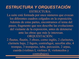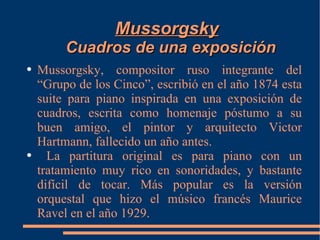 El documento resume la suite para piano Cuadros de una exposición de Mussorgsky, inspirada en una exposición póstuma de cuadros de su amigo Hartmann. Explica la estructura de los 11 números que evocan los cuadros, y la versión orquestal de Ravel. Brevemente describe cada número, incluyendo Promenade, Gnomos, Ill vecchio castello, Tullerías, Bydlo, Ballet de los polluelos, Samuel Goldenberg y Schmuyle, El mercado de Limoges, Las Catacumbas, La cabaña sobre
