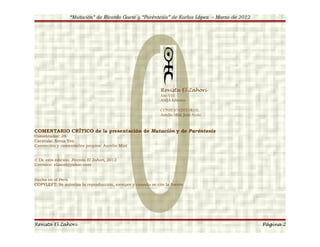 Este documento presenta un resumen crítico de las obras teatrales "Mutación" de Ricardo Gaete y "Paréntesis" de Karlos López, estrenadas en marzo de 2012 en Lima, Perú. Analiza aspectos como el uso de un solo actor, la manipulación de objetos, la iluminación, el vestuario y si las obras tratan de contar una historia o mostrar virtuosismo actoral. El crítico intenta comparar y contrastar ambas obras para reflexionar sobre la práctica teatral, aunque reconoce que esto
