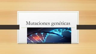 Una mutación genética es una alteración permanente de la secuencia de ADN que compone un gen. Existen mutaciones genómicas que afectan todo el genoma y se heredan, y mutaciones somáticas que ocurren en algunas células durante la vida. Las mutaciones más comunes son la fibrosis quística causada por una mutación en el gen CFTR, la enfermedad de Huntington debido a una mutación en el gen de la huntingtina, y el síndrome de Down que involucra una copia extra del cromosoma 21.