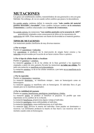 Las mutaciones son cambios en el material genético que pueden transmitirse a la descendencia. Existen varios tipos de mutaciones como mutaciones puntuales en la secuencia de ADN, mutaciones cromosómicas que alteran la estructura de los cromosomas, y mutaciones numéricas que afectan el número de cromosomas. Las mutaciones son la fuente de variabilidad genética necesaria para la evolución y adaptación de las especies.