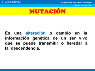 El documento describe las mutaciones como cambios en la información genética que se pueden transmitir. Explica que las mutaciones pueden ser espontáneas durante la replicación del ADN o inducidas por sustancias mutágenas como radiaciones o químicos. También menciona que las mutaciones incluyen sustitución, inserción o deleción de bases nitrogenadas en el ADN.