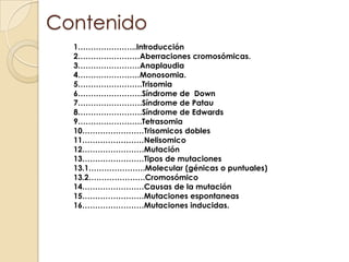Este documento describe diferentes tipos de aberraciones cromosómicas como la aneuploidía, monosomía, trisomía, tetrasomía y mutaciones. Explica síndromes como Down, Patau y Edwards asociados con trisomías. También describe tipos de mutaciones a nivel molecular y cromosómico, así como causas de mutaciones espontáneas e inducidas.