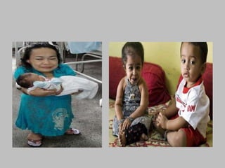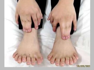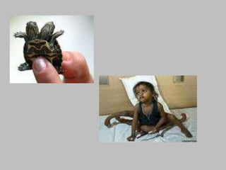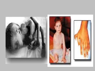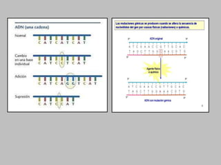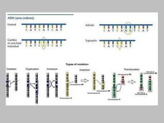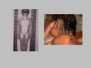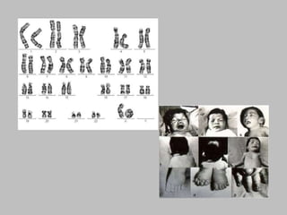 El documento aborda varias mutaciones y síndromes genéticos, destacando el caso de un niño alemán con una doble mutación que le proporciona musculatura excepcional, así como el síndrome de Turner y Klinefelter, ambos asociados a alteraciones cromosómicas que impactan el desarrollo físico y otras características de salud. Se mencionan también tratamientos, como la administración de hormonas para tratar el síndrome de Turner, aunque algunos casos, como la acondroplasia, no tienen cura. Estos trastornos muestran la complejidad de la genética y su influencia en la salud humana.