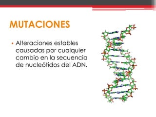Las mutaciones son alteraciones estables en la secuencia de ADN causadas por cambios en los nucleótidos. Existen mutaciones espontáneas debidas a errores en la replicación o daños en el ADN, e inducidas por agentes físicos, químicos o biológicos. Las mutaciones pueden ser puntuales cuando afectan solo un par de bases o estructurales cuando involucran la pérdida, ganancia o reordenamiento de segmentos cromosómicos. Las mutaciones numéricas alteran el número total de cromosomas o juegos