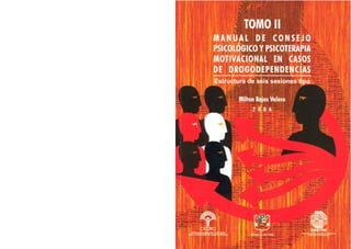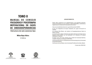 El manual presenta una estructura de seis sesiones tipo para el consejo psicológico y la psicoterapia motivacional en casos de drogodependencia. El manual comprende dos módulos. El primer módulo cubre principios básicos como los indicadores del consumo de drogas, la evaluación de patrones de consumo y consejería familiar. El segundo módulo analiza el desarrollo de seis sesiones con temas como la bienvenida, técnicas basadas en información y control de estímulos. Cada sesión se des