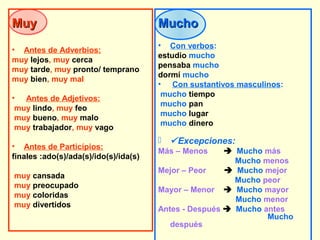 El documento explica el uso de los adverbios "muy" y "mucho" en español. "Muy" se usa antes de adjetivos, adverbios y participios para dar énfasis, mientras que "mucho" se usa con sustantivos y verbos para indicar cantidad. El documento también incluye ejemplos y excepciones a estas reglas.
