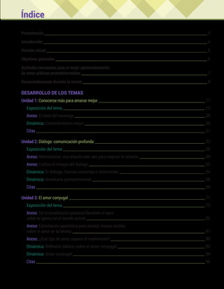 Este documento presenta un curso de preparación al matrimonio cristiano dividido en 8 unidades temáticas. La primera unidad se titula "Conocerse más para amarse mejor" y busca que las parejas se conozcan a profundidad para fortalecer su amor. Otras unidades tratan sobre la comunicación, el amor conyugal, el sacramento del matrimonio, la sexualidad, la paternidad responsable, la comunidad de bienes y los desafíos posteriores al matrimonio. El objetivo general es preparar a los futuros esposos