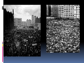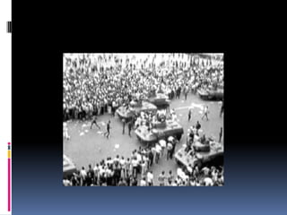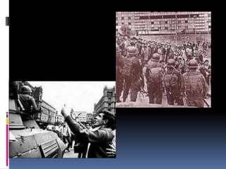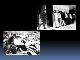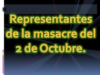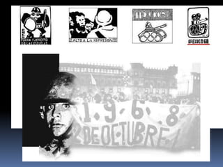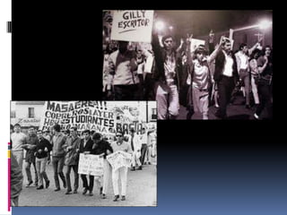 El documento describe los antecedentes y los eventos del 2 de octubre de 1968 en la Plaza de las Tres Culturas en Tlatelolco, México. Ese día, miles de estudiantes se reunieron para una manifestación pacífica cuando el ejército mexicano abrió fuego contra la multitud después de que una bengala fuera lanzada desde un helicóptero, dejando muchos muertos y heridos.