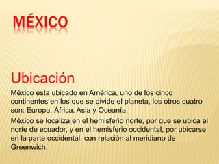 México se ubica en América del Norte, al sur de Estados Unidos. Su economía se basa en el mercado libre y las exportaciones, siendo la 11 economía más grande del mundo. Aunque México no tiene religión oficial, alrededor del 80% de la población se identifica como católica. Algunas de sus ciudades más importantes son la capital Ciudad de México, Monterrey, un centro industrial, y Guadalajara, la segunda ciudad más grande. La gastronomía mexicana combina tradiciones indígenas y europeas y ha