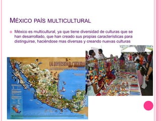 México es un país multicultural debido a la diversidad de culturas que se han desarrollado y creado sus propias características, haciéndose más diversas y creando nuevas culturas. Esta diversidad cultural se observa en las tradiciones, el arte popular, las costumbres y las formas de expresión de los diferentes grupos del país, así como en los intercambios culturales que han ocurrido a través de la transculturación y la aculturación.