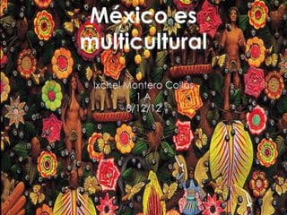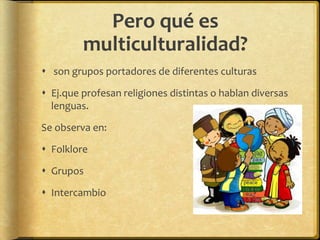 El documento define la multiculturalidad como grupos portadores de diferentes culturas que pueden profesar religiones distintas o hablar lenguas diversas. Explora conceptos como el folklore, grupos e intercambios culturales. Define el folklore como la expresión cultural de un pueblo que incluye tradiciones y arte popular. Los grupos se describen como dos o más individuos que interactúan para alcanzar objetivos comunes. Los intercambios culturales incluyen la transculturación, donde una cultura adopta rasgos de otra, y la aculturación, que implica la imposición