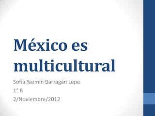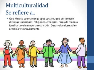 México es un país multicultural compuesto por diversos grupos sociales con diferentes tradiciones, religiones y razas que coexisten en armonía. La cultura mexicana incluye folklore con danzas, música y arte tradicionales, así como costumbres y formas de expresión que se heredan de generación en generación. México también participa en el intercambio cultural con otras regiones a través de procesos como la transculturación y la aculturación.
